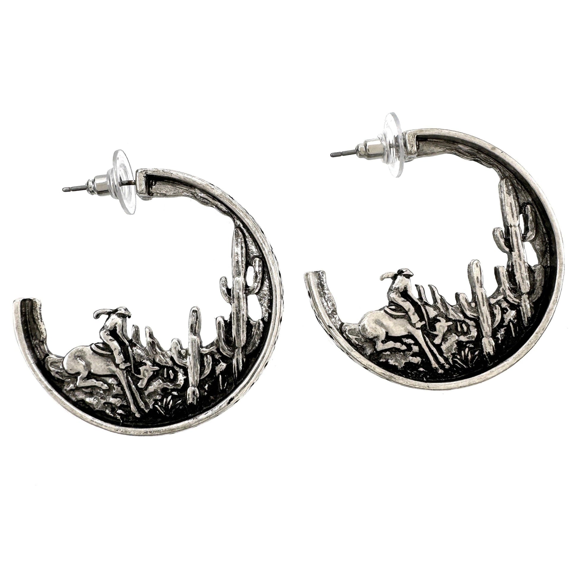 Complete your western look with these charming Cowboy Riding in Cactus Field on C Hoop Earrings! Made with intricate details, these earrings are perfect for any cowgirl or cowboy. The perfect accessory to showcase your love for country living and add a touch of charm to any outfit. Time to saddle up and show off your style!