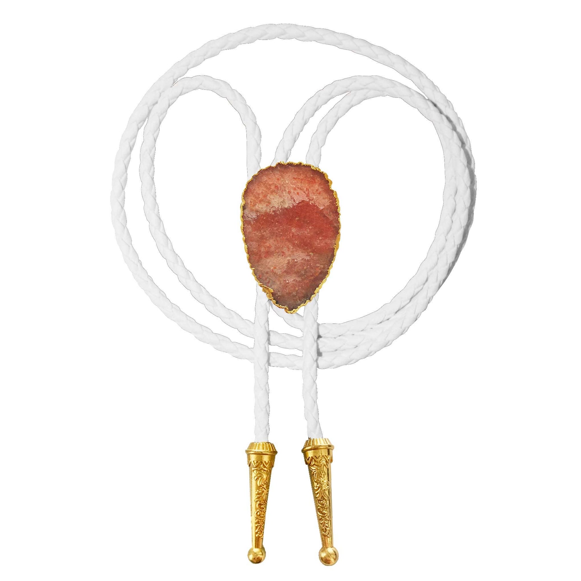 This boho western style bolo tie necklace features a sparkling pink gemstone with gold trim on braided vegan leather