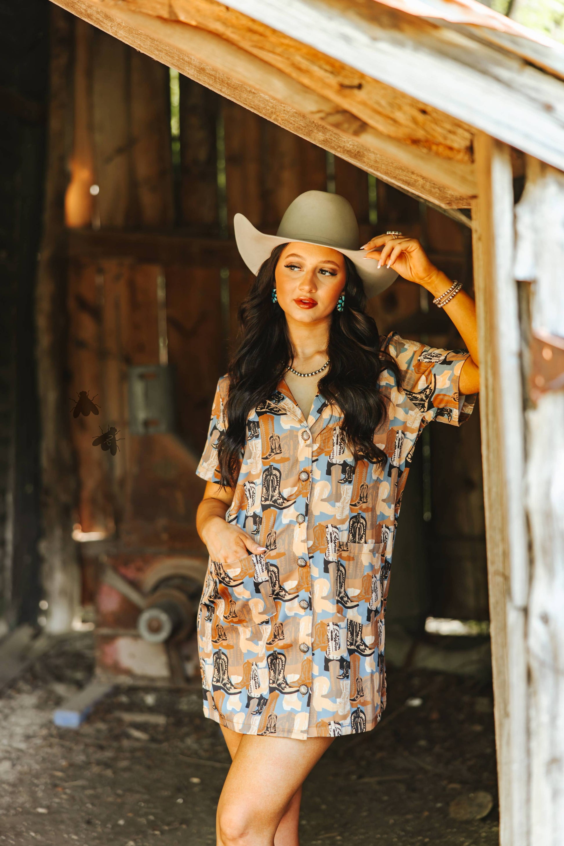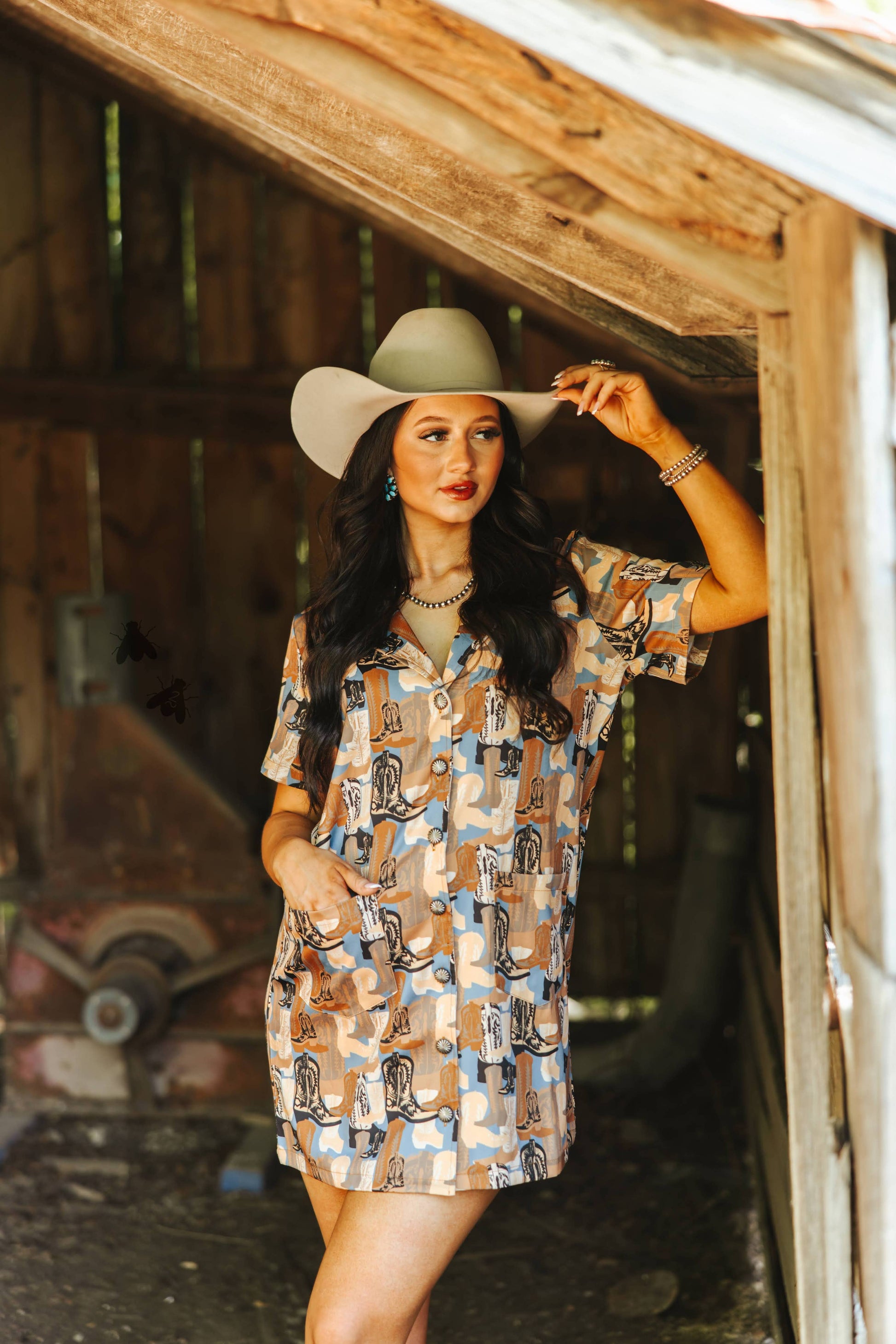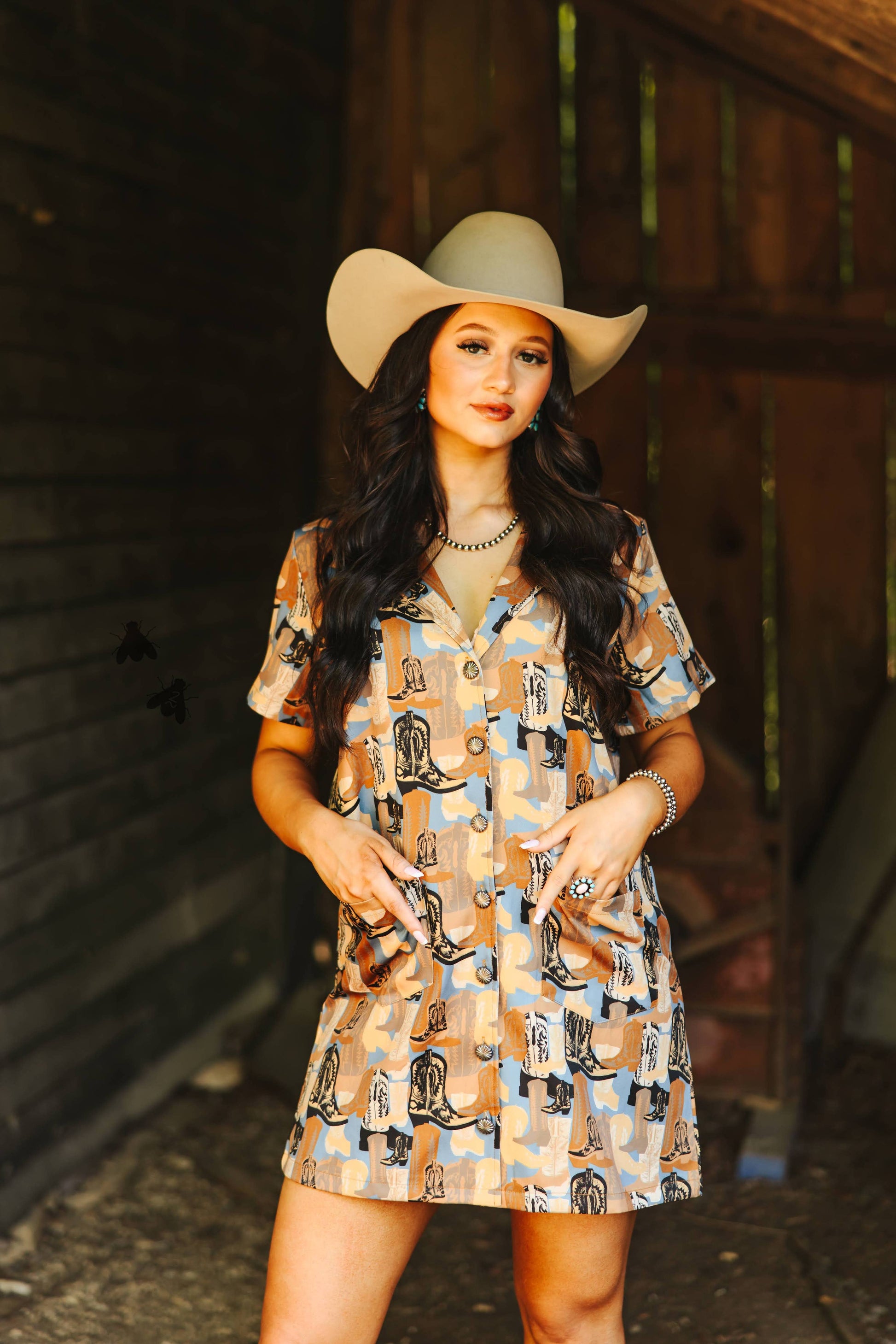 This dress is funky Chic with a cute western boot pattern. It's a t-shirt button down style so its comfy and cute!