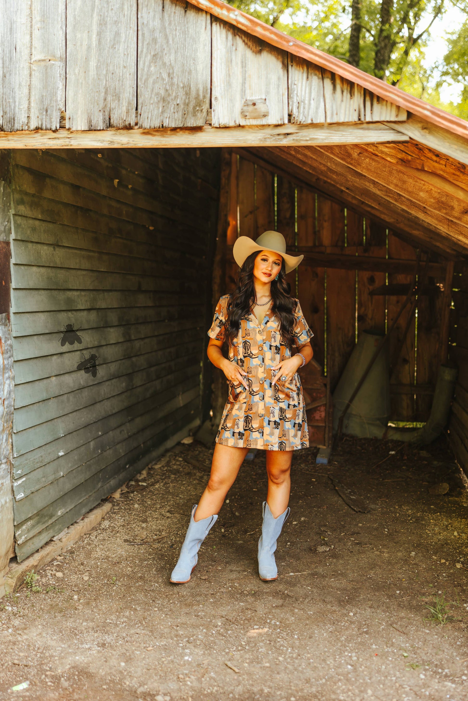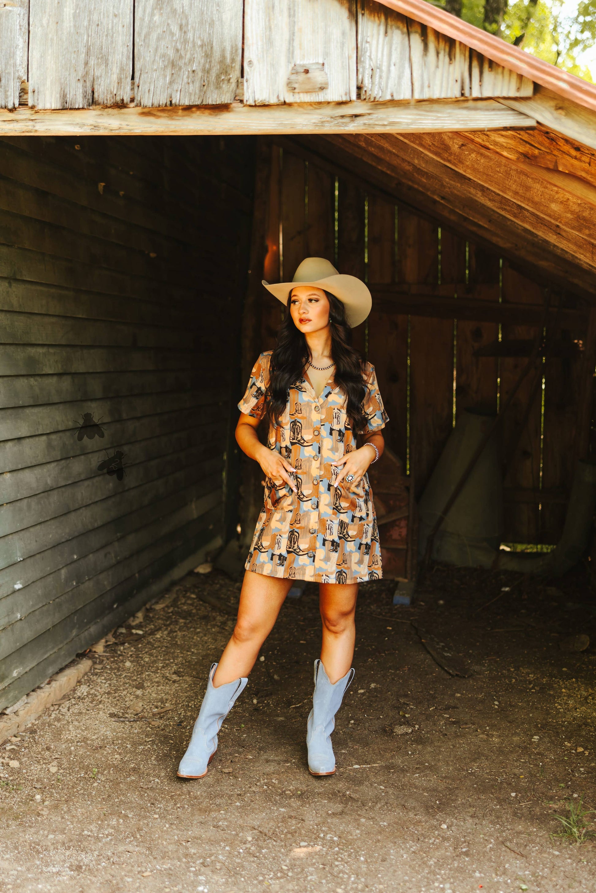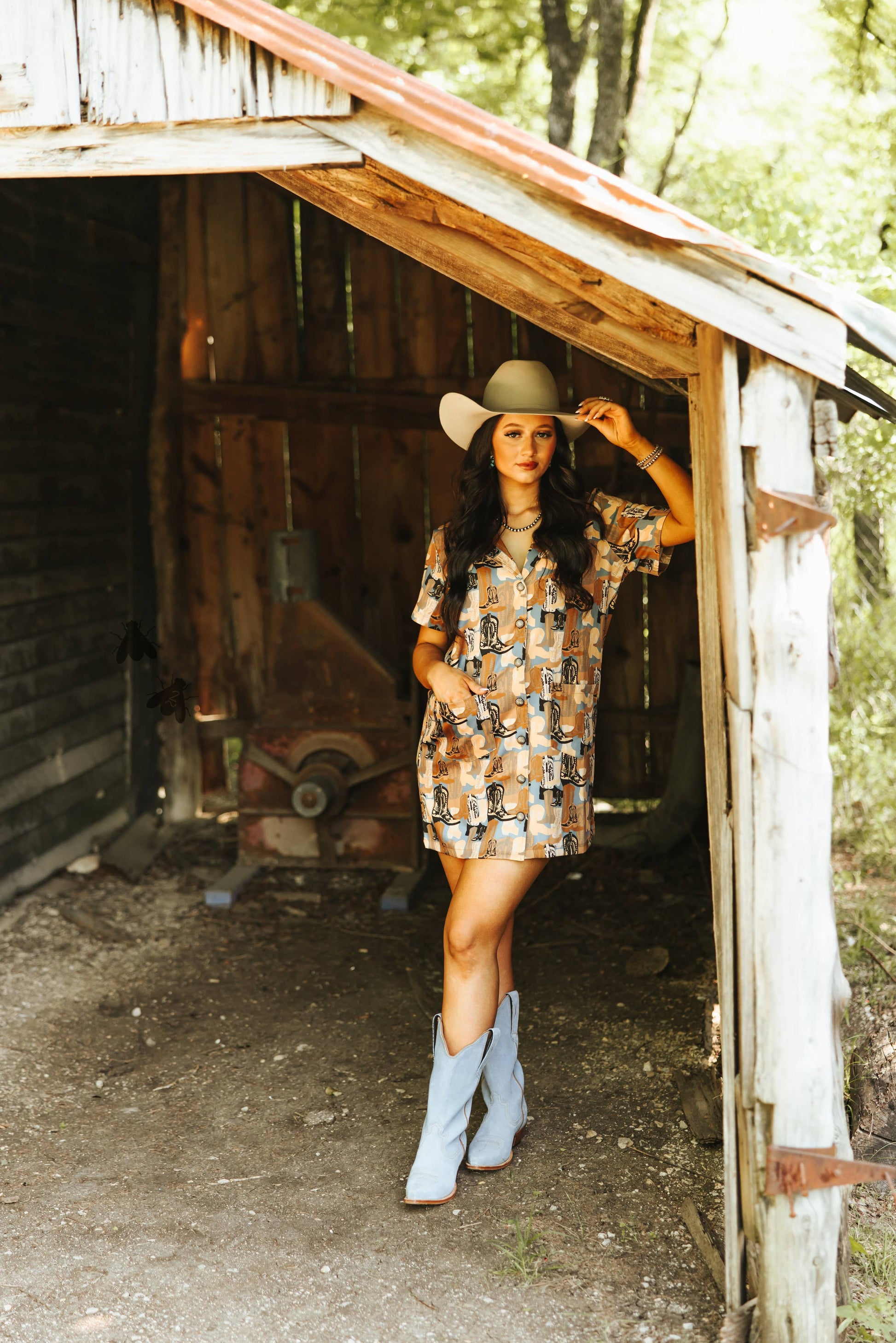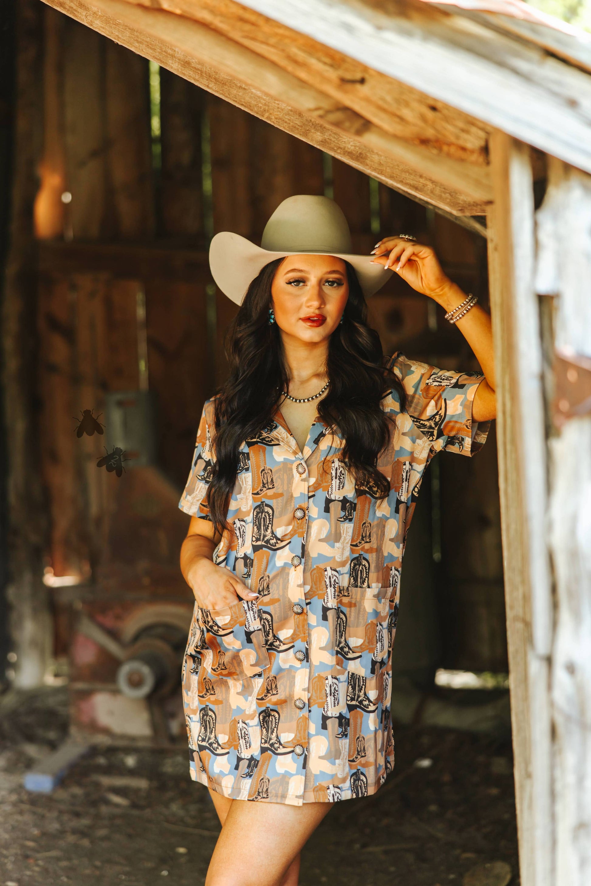 This dress is funky Chic with a cute western boot pattern. It's a t-shirt button down style so its comfy and cute!
