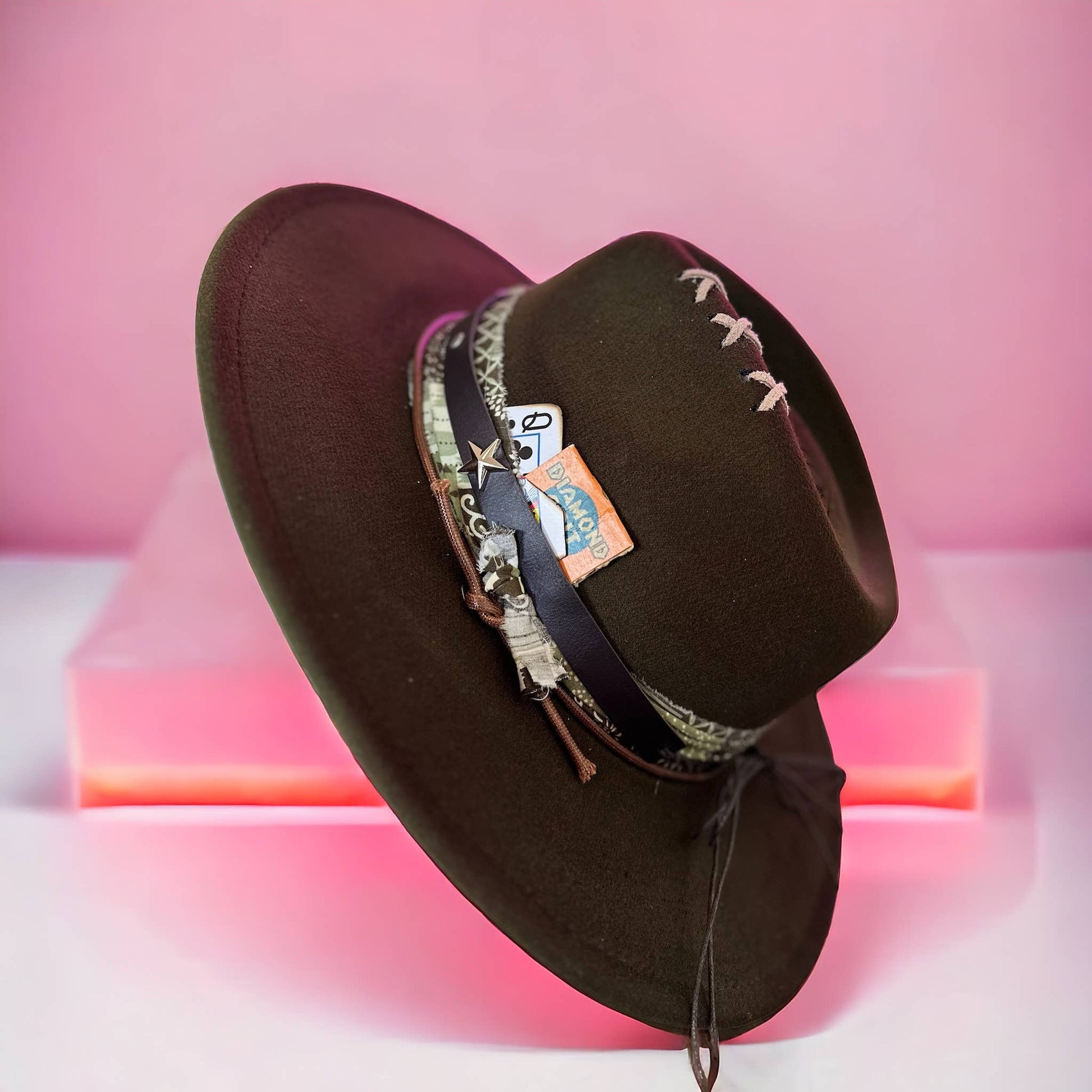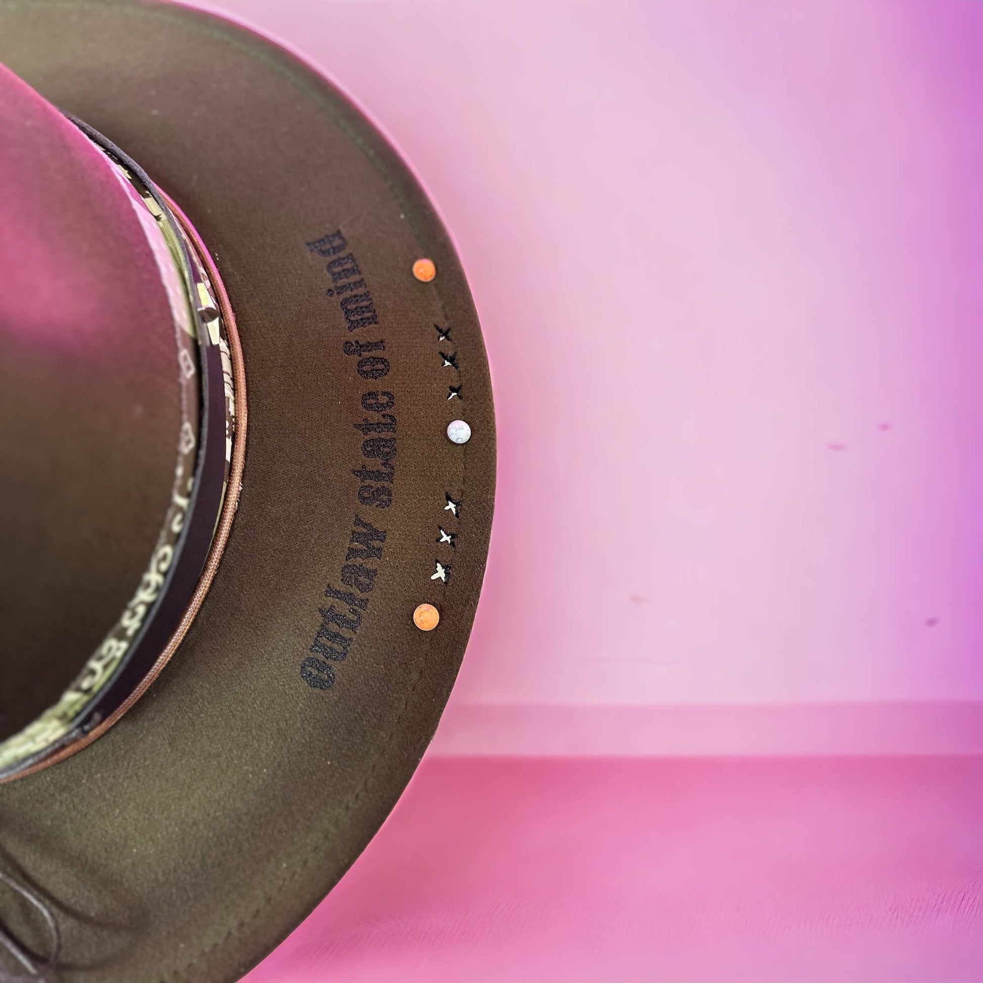 Fully decorated Western rancher style hat. Burnt Hat with “outlaw state of mind” burnt onto the brim. Playing card symbols burnt onto the top of the hat. Hat comes exactly as shown includes all trim and details.