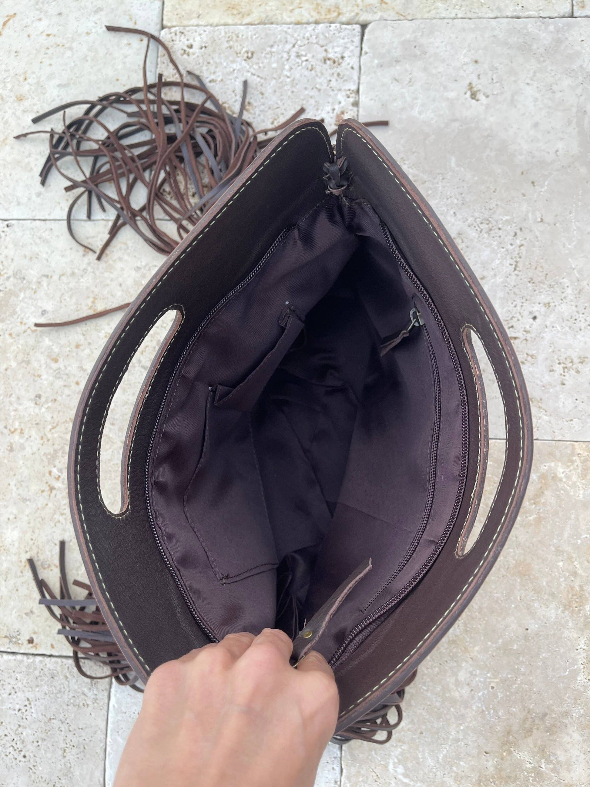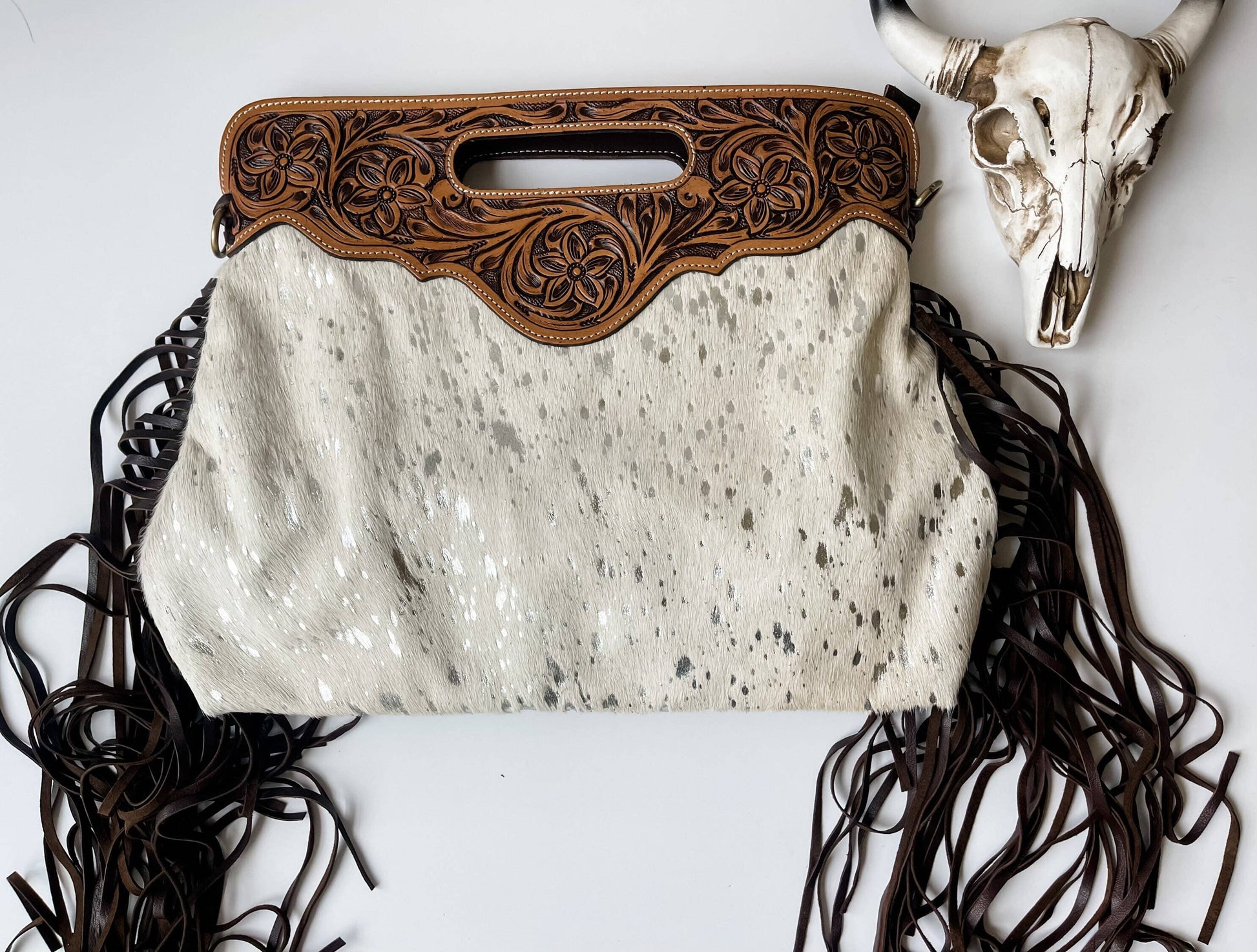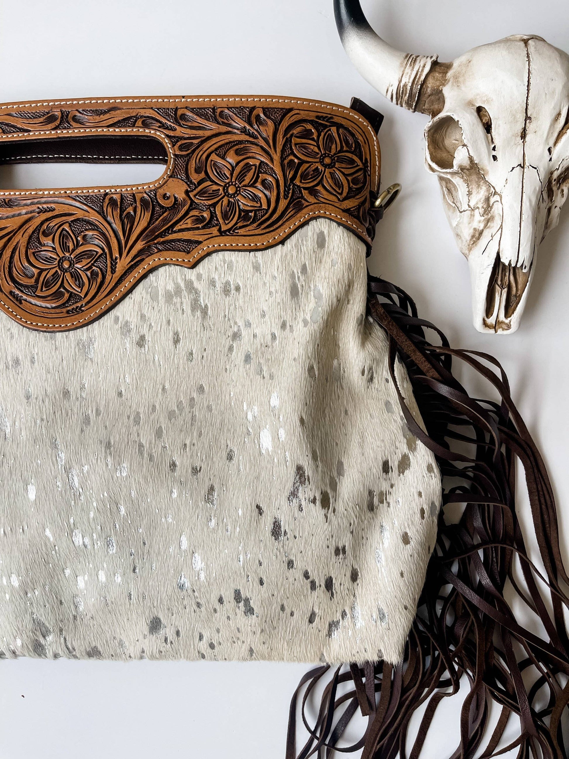 Main compartment holds your keys, wallet, phone, makeup bag, etc. Zippered closure Inside zippered pocket 2 open pockets inside strap is adjustable Strap is removable to use as a handbag/clutch back of the purse is all leather Genuine Leather Fringe 14.5” x 12” x 4” cream beige cowhide with silver speckles Brown leather.