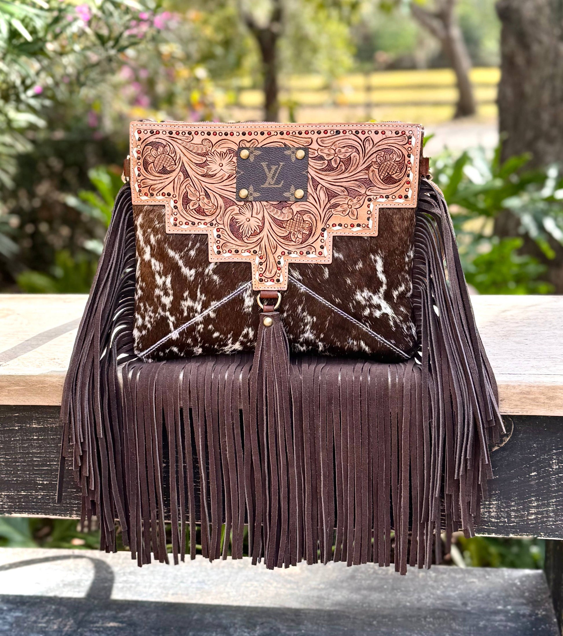 Upcycled LV Cowhide Tooled Leather Fringe Crossbody Bag