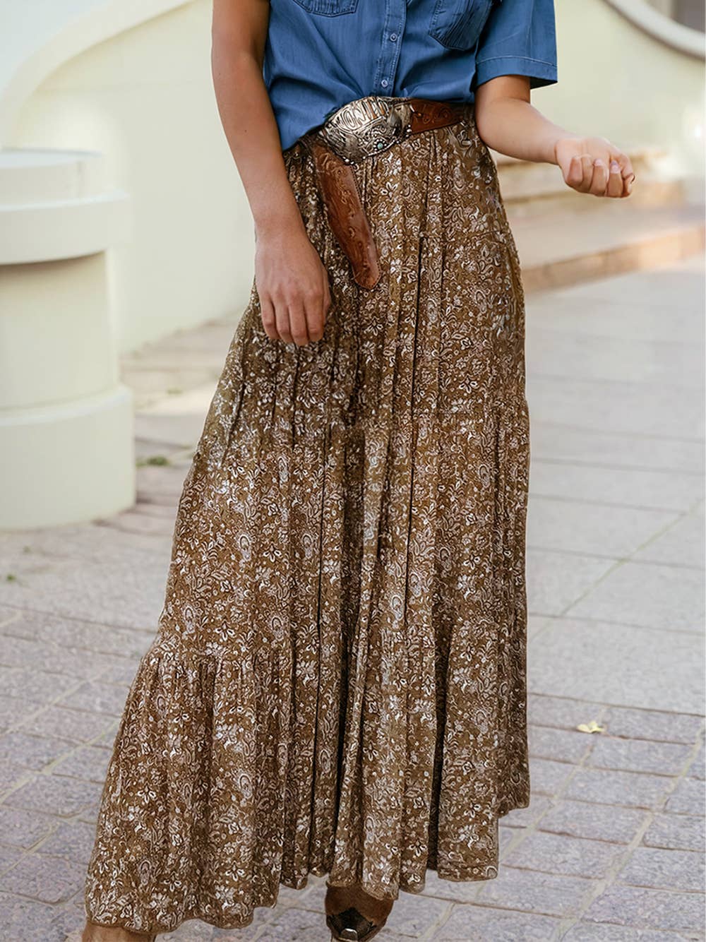 Western Floral Print Ruffled Hem High Waist Loose Maxi Skirt