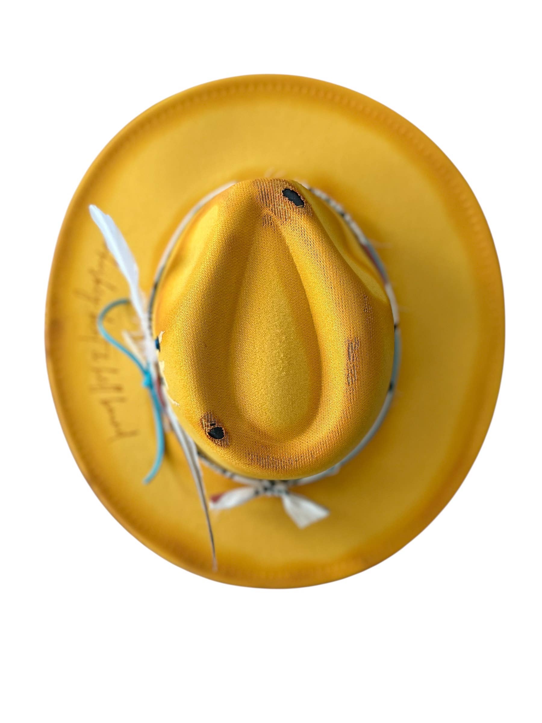 Our newest design featuring a hand painted skeleton hand, paired with turquoise chips. “Whiskey Bent & Hell Bound” script. Hand burnt to perfection! Available on yellow or tan fully adjustable rancher. Lightweight and comfortable!